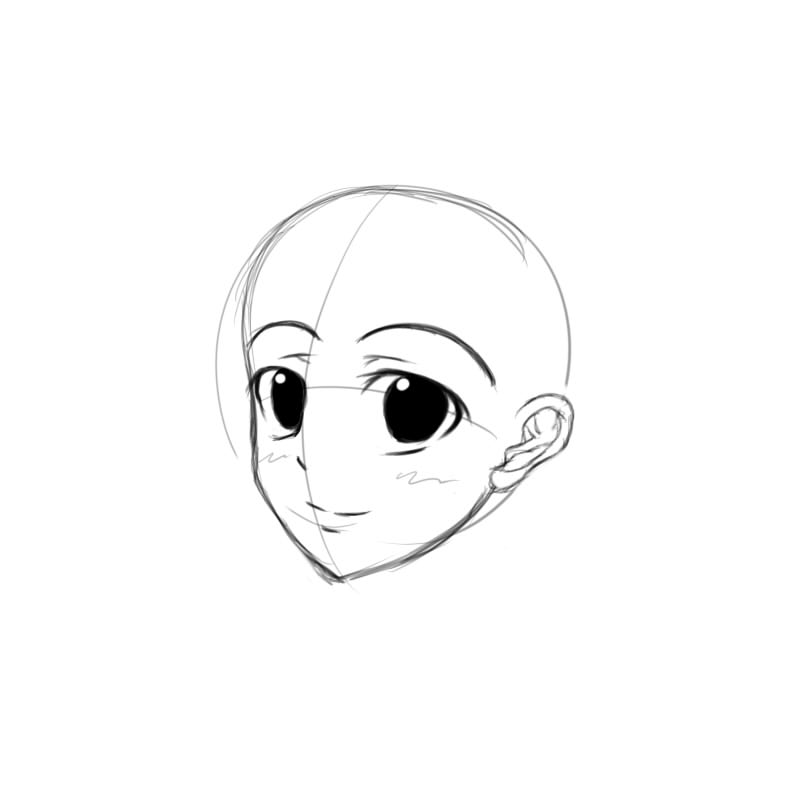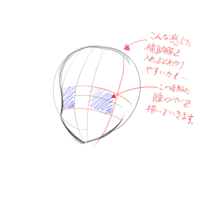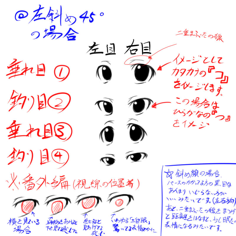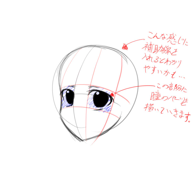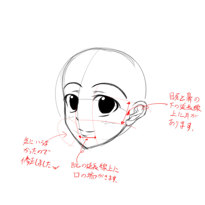 前回輪郭まで描いてみたので、今回は目を描いていきたいと思います。 まず、この絵をご覧下さいw 一応、ボクの描き方を例に挙げて色々描いてみました。 イラストが小さいと感じる方は、クリックしてもらうと拡大されます。 まぁ、こんだけ目ばっかり並ぶと気持ち悪いですが…ww とりあえず、ボクはこんな感じで描いてます。 この辺りが一番違いの出るところだとおもいますので、 ぜひ練習してもらえたらと思います。 練習方法として、ホント一番いいのが模写ですww 好きな原画家や漫画家の絵をまねて描いてみるのが一番だと… そうやって、自分好みの目を作っていってください。 あと、後々正面とかも作りますので、今回は斜めの場合ということで…ww では、本格的に描いていきましょうw 先ほどの輪郭に補助線をいれてみます。 そうすることで、大体のバランスとか位置とかがわかり易くなると思います。 球体を意識して、バランスのいいところに描いてみてください。 ある程度試行錯誤して、ご自身の好きな位置とかを作ってください。 では、この目の位置に目を描いていきます。 とりあえず、こんな感じになりました。 ある程度の位置がわかっていると、ホント描きやすいと思いますよw まぁ、手癖みたいなものもあるので、慣れが一番重要だと思いますが…ww ある程度描けたら、こんな感じに一度反転してください。 そうすることで、バランスの崩れとかが良くわかると思います。 反転して違和感をあまり感じないようであれば、OKだと思います。 (まぁ、僕自身もこの辺りでいつも苦労してますが…ww) では、元に戻して、他のパーツも描いていきましょうw とりあえず、鼻、口、耳、眉を描き加えましたw この辺りのバランスについては、下の絵をご覧下さいw まぁ、ご自身の顔を触ってもらえればわかると思いますが、 だいたいこんな感じのバランスになってます。 まぁ、ある程度崩しても問題ないんですけどねww 目安程度で考えてもらえればOKだと…ww あと、耳の中にかんしては、ある程度適当に描いてもそれっぽく見えますw 逆に細かく描き過ぎると気持ち悪くなる気がしますので…ww また、描いている途中で気にいらない箇所が出てきたら、すぐに修正しましょうw 今回は輪郭が気に食わなかったので修正しましたw というわけで、顔がこれで完成しました。 まぁ、描いてて一番楽しい箇所だと思いますので、 何回も練習して自分の絵を作ってくださいw では、次回は髪の毛を描いていきたいと思います。